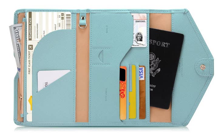 22. A travel-friendly wallet with Rfid-blocking material to keep your identity safe and your passport, credit cards, ID, and boarding pass neat and easy to access.